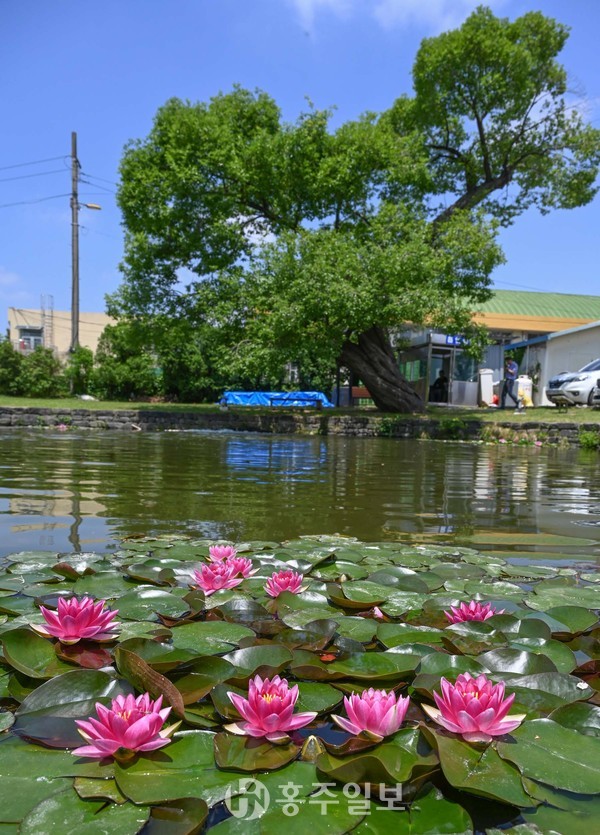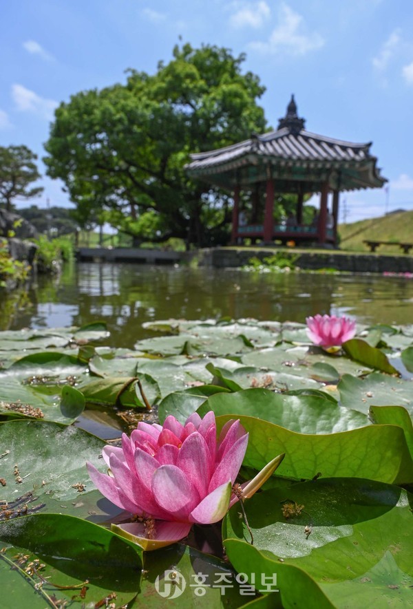 햇볕이 풍부하고 만물이 점차 생장해 가득 찬다는 여름이 시작되는 계절을 의미하는 소만(小滿)이 하루 지난 21일 홍성군 12경 중 하나인 홍주읍성 내 안회당 뒤 뜰에 위치한 여하정에 연못 속 수련이 꽃망울을 활짝 터뜨렸다.