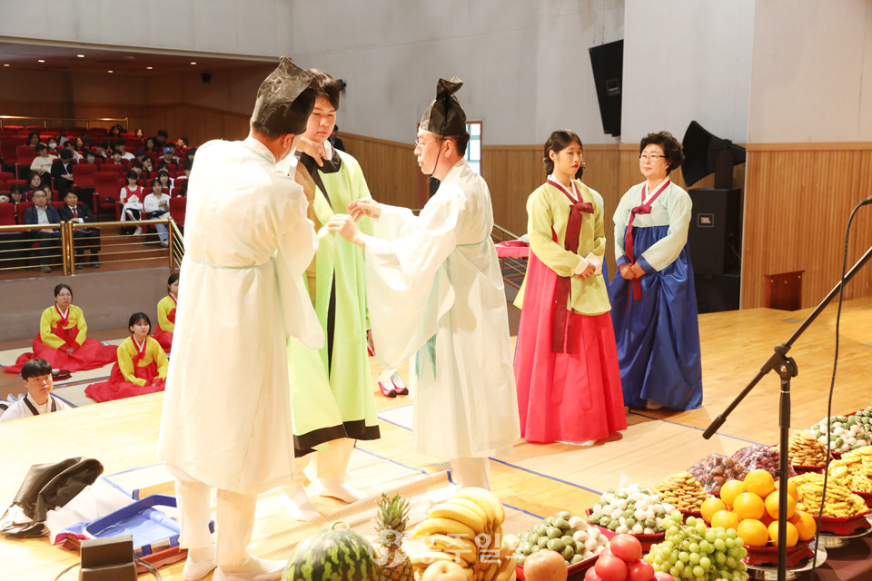 맨인브라스밴드의 식전공연을 시작으로 열린 이날 전통성년식은 유환동 홍성문화원장을 주례로, 꽃맘 월전 권혜숙 씨를 계자빈으로 모시고 혜전대학교 성년자를 대표해서 호텔조리계열 전성민 군과 작업치료과 주유정 양이 관자와 계자를 맡아 진행됐다.