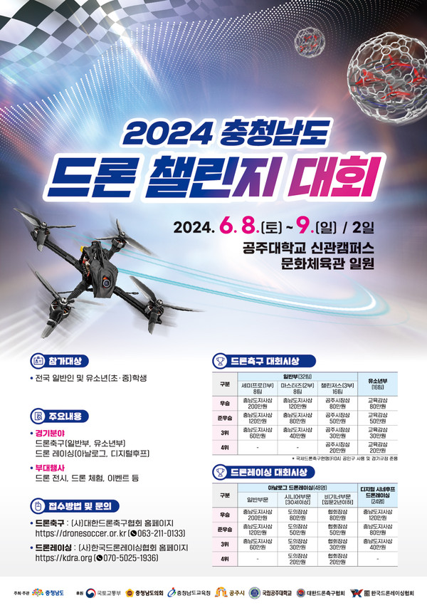 충남도가 드론 애호가들의 새로운 메카로 떠오르고 있다. 다음달 8~9일까지 국립공주대학교 문화체육관·잔디광장에서 열리는 ‘2024 충청남도 드론 챌린지 대회’가 그 중심에 있다. 이 대회는 충남도가 주관하며 국토교통부와 도교육청, 공주시 등 7개 기관의 후원을 받아 진행된다.
