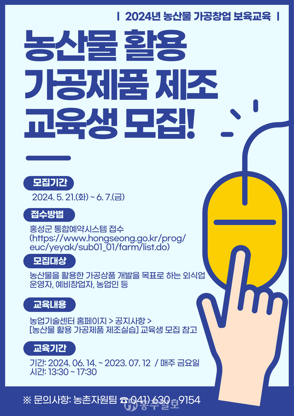 교육 신청은 홍성군 통합예약시스템을 통해 가능하며, 가공제품 제조 과정은 5월 21일부터 6월 7일까지, 디저트 제조 과정은 6월 17일부터 신청할 수 있다. 각 과정별로 16명의 교육생을 모집할 예정이며, 보다 자세한 일정과 내용은 홍성군농업기술센터 홈페이지의 공지사항에서 확인할 수 있다.