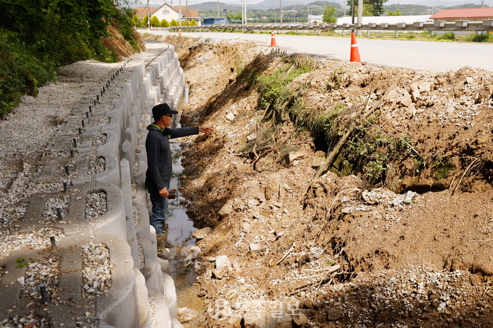 안녕하세유~ 홍동면 문당리 문산마을 이장 이선재입니다. 지난 16일 홍동면 문당리 마을 입구에서 진행 중인 하천 사면 복원 작업이 거의 마무리 단계에 접어들었어요. 그러나 작업이 진행되는 과정에서 예상치 못한 문제가 발생했어요. 하천 복원 작업의 한쪽은 거의 완성됐지만, 바로 맞은편 하천의 밑바닥 부분에 위치한 오래된 석축이 내려앉기 시작했어요. 이로 인해 도로변 가드레일 설치의 필요성이 무의미해졌어요. 공사 현장확인 결과, 하천 둑 제방을 따라 석축 길이 200미터 이상 침하하는 현상이 발견됐습니다.