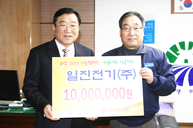 ▲ 홍성일반산업단지 입주를 앞두고 있는 일진전기(주)(대표이사 허정석·이윤영)가 홍성군에 이웃사랑 성금 1000만원을 기탁했다. 기금을 전달하고 있는 김희수 부사장<사진 오른쪽> 저작권자 © 홍주일보 무단전재 및 재배포 금지 홍주일보 다른기사 보기 페이스북 카카오톡 URL복사 기사공유하기