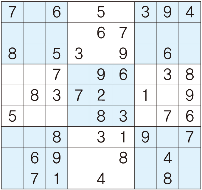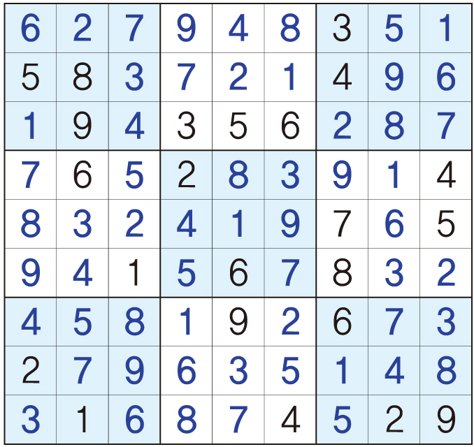 3. 큰 정사각형(9x9) 안에 있는 작은 정사각형(3x3) 안에는 숫자 1~9가 각 한 번씩 들어간다.