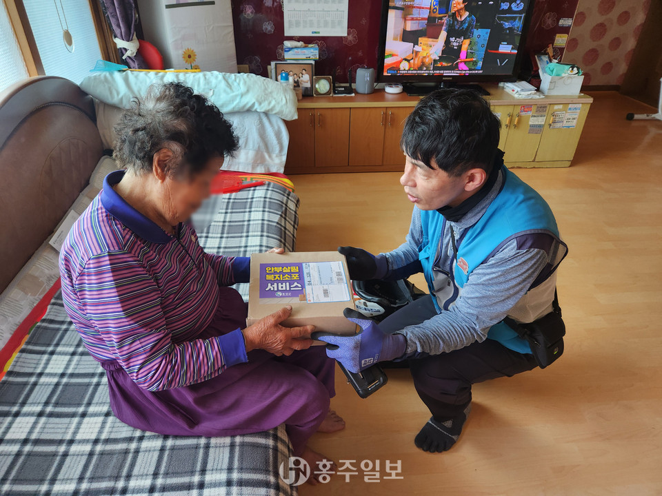 ‘안부살핌 복지소포 서비스’는 지난 5월 홍성군과 홍성우체국의 업무협약으로 시작됐다. 고독사 고위험 가구 80가구를 대상으로 우체국 집배원이 월 2회 생활용품을 직접 배달하고 안부를 확인한다.