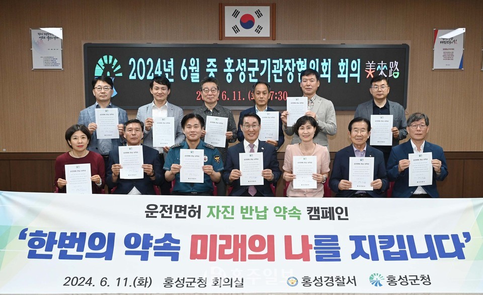 지난 11일 홍성군청 회의실에서 열린 홍성군기관장협의회에서 이용록 군수를 비롯한 15개 기관장들이 ‘운전면허 반납 서약서’에 서명하며 고위험운전자 면허 반납 분위기를 조성하는 뜻깊은 시간을 가졌다. 이번 캠페인은 교통안전의식 제고와 고위험운전자 교통사고 예방을 목표로 하고 있다.