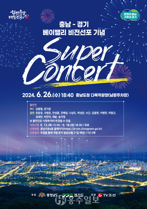 충청남도와 경기도가 베이밸리 비전 선포를 기념해 슈퍼콘서트를 개최한다. 이번 콘서트는 오는 26일 오후 6시 40분부터 충남도청 다목적광장(남문주차장) 특설무대에서 열릴 예정이다.
