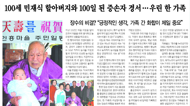 지난 3월 8일자 본지 1면에는 100세 생신상을 받은 할아버지와 생애 첫 생일상을 받은 증손자 경서의 행복한 모습이 실렸다. 금마면 인흥마을에서 천수를 맞은 민재식(100. 금마면 인산리) 할아버지는 당시 "친구들은 이미 다 갔고 이만큼 살았는데 더 바랄 것이 있겠냐"며 다만 "가족이 다 건강했으면 좋겠다"고 말했다.