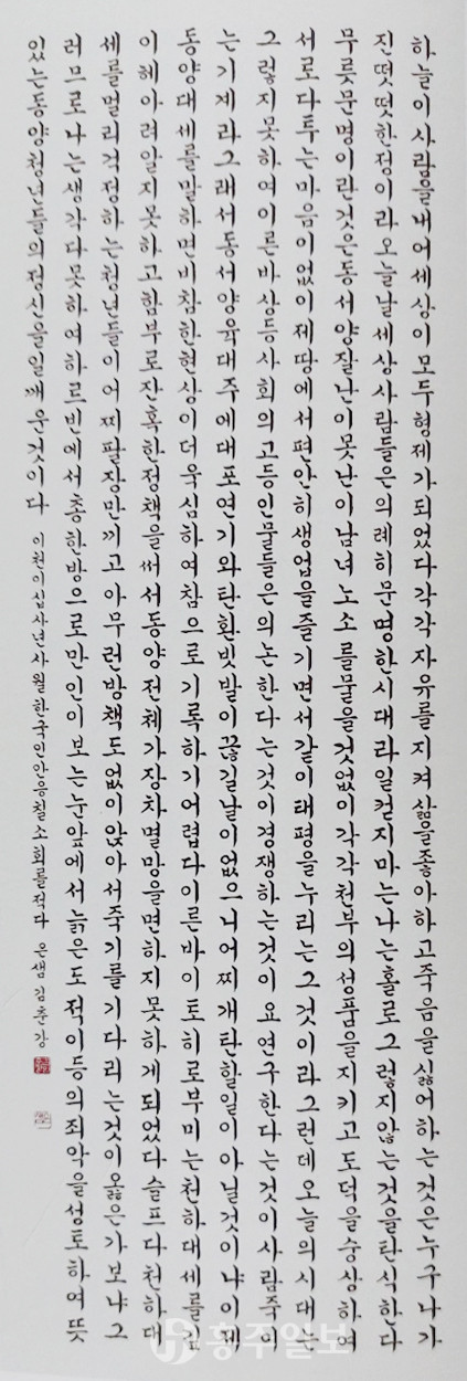 홍성출신의 은샘 김춘강 서예가가 ‘제43회 대한민국미술대전’ 서예부문에서 작품 ‘한국인안응칠소회’를 출품해 입상하는 영예을 안았다.