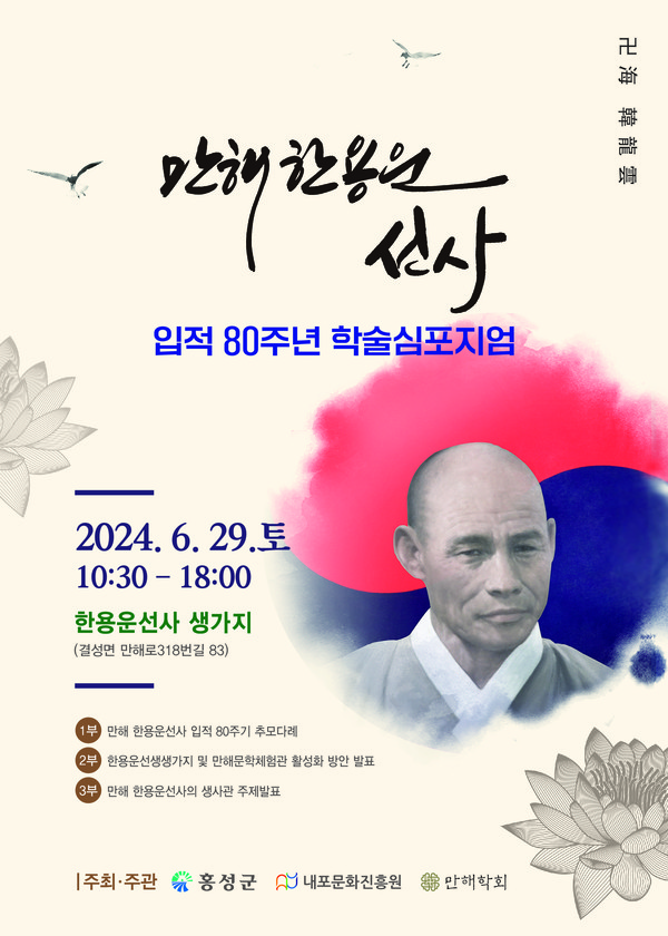 이번 학술심포지엄은 입적 80주기의 의미와 생가지라는 장소성을 반영해 1부 추모다례를 시작으로, 2부 한용운선생생가지 및 만해문학체험관 활성화 방안 발표, 3부 만해 한용운 선사의 생사관을 주제 발표 순으로 이어진다.