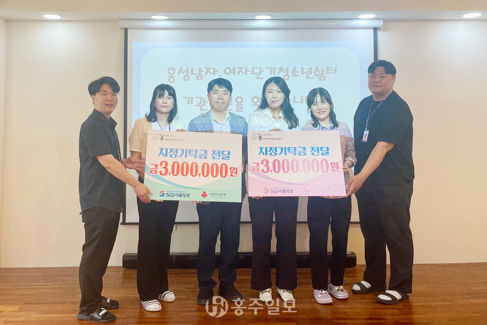 SGI서울보증보험(지점장 김영록)은 지난 20일 청소년들을 위해 사용해 달라며 홍성남자단기청소년쉼터와 홍성여자단기청소년쉼터에 각각 후원금 300만 원씩 전달했다.<사진>