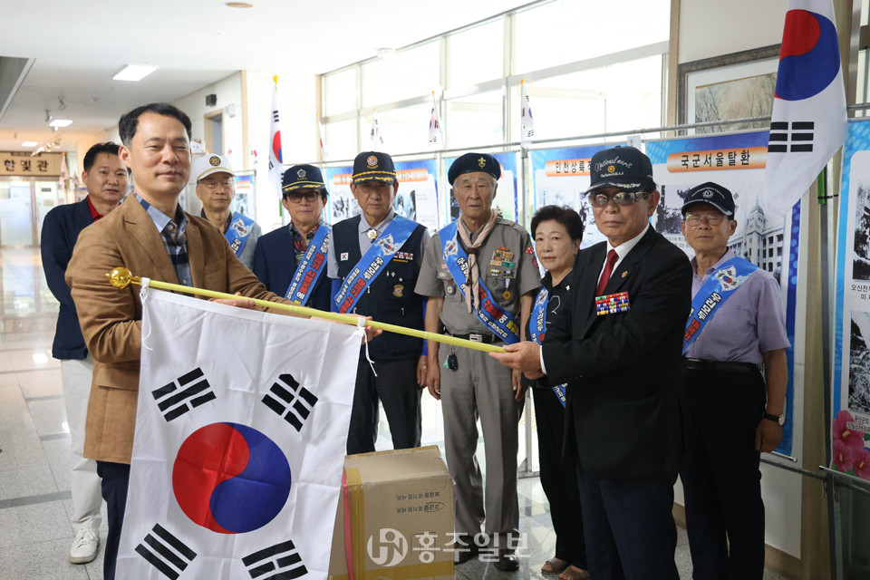 홍성고등학교(교장 신광덕) 본관 1층에는 지난 24일부터 25일까지 6·25 한국전쟁 74주년과 호국보훈의 달을 맞이해 대한민국무공수훈자회 충남지부 홍성군지회에서 실시하는 사진전시회가 열렸다. 홍성군보훈단체협의회(회장 최종수) 보훈단체 관계자들은 지난 24일 홍성고에 방문해 신광덕 교장에게 태극기 국기함 세트 50개를 전달하며 6·25 한국전쟁의 의미를 기렸다.