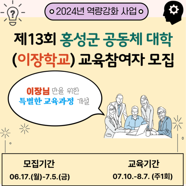 홍성군마을만들기지원센터가 마을발전의 핵심 역할을 하는 이장들을 위한 제13회 공동체 대학 심화과정 ‘이장학교’ 참여자를 오는 7월 5일까지 모집한다.