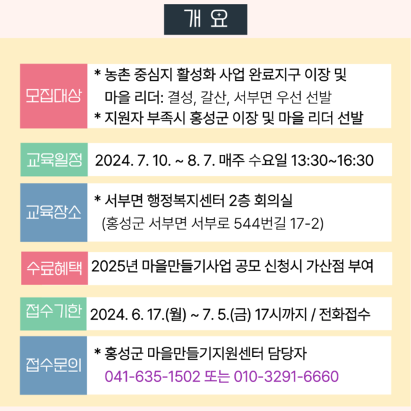 자세한 정보는 홍성군마을만들기지원센터(041-635-1502) 또는 공식 블로그에서 확인할 수 있으며, 사업 신청이 저조할 경우 대상 범위를 홍성군 전체로 확대할 예정이다.