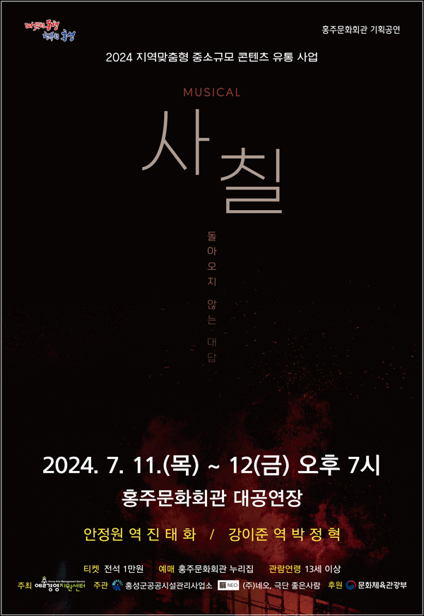 홍성군 홍주문화회관이 문화체육관광부와 예술경영지원센터가 주최하는 ‘2024년 지역맞춤형 중소규모 콘텐츠 유통사업’에 선정돼 뮤지컬 ‘사칠’을 오는 7월 11일과 12일 양일간 선보인다. 이 공연은 지역 주민들에게 소방관들의 헌신과 희생을 알리고, 그들의 삶을 더욱 가까이서 느낄 수 있는 기회를 제공한다.