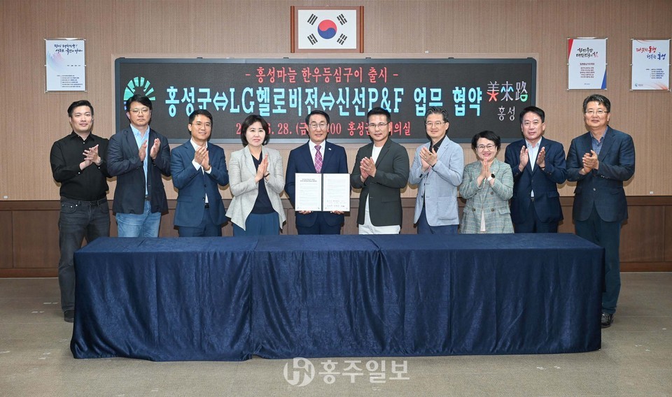 홍성군은 28일 홍성군청 회의실에서 LG헬로비전, 신선P&F와 함께 ‘홍성마늘 한우등심구이’ 제품 출시를 위한 업무협약을 체결했다. 이번 협약을 통해 7월 중 지역 채널커머스를 통해 본격적인 제품 개발·홍보를 실시할 예정이다.<사진>