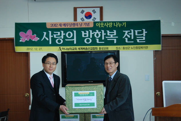 홍성 하나님의 교회(당회장 김성수)는 지난달 27일 노인종합복지관을 방문해 방한용 조끼 80벌을 박민성 사무국장에게 전달했다. 김성수 당회장은 "따뜻한 방한복으로 어르신들이 건강하게 겨울을 났으면 한다"는 바람을 전했다.