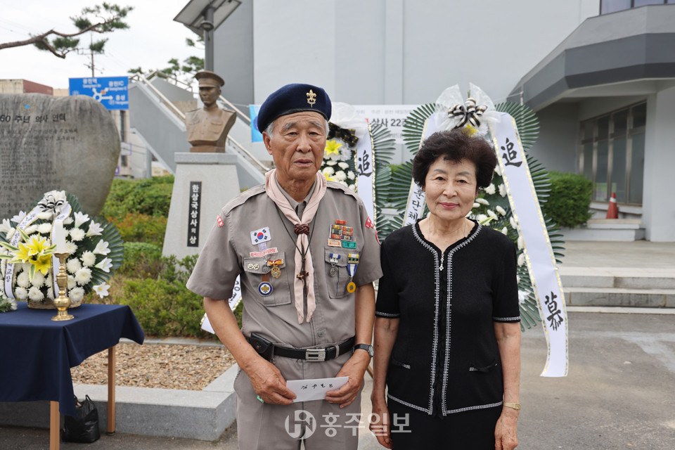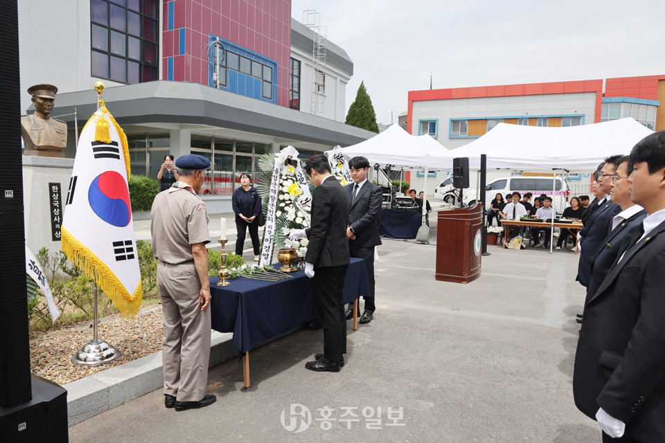 충남드론항공고등학교총동창회(회장 김경환)가 주최하고 광천제일장학회(이사장 김주호)가 주관한 이번 추모식에는 서정미 충남서부보훈지청장과 최종수 홍성군보훈단체협의회장을 비롯한 보훈단체장, 강승규 국회의원, 이용록 홍성군수, 정동규 광천읍장, 장재석·권영식·이정윤 홍성군의회 의원, 이종화·이상근 충남도의회 의원, 이보형 광천농협 조합장 등 내외빈과 한 상사의 광천상고 재학 시절 은사였던 서종화 교장, 함께 공부하며 학창시절을 보낸 동문과 선후배들이 참석해 고인을 추모했다.