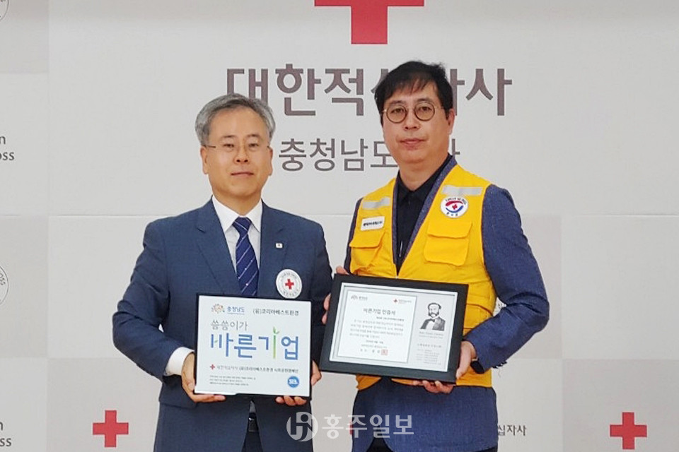 대한적십자사 충남지사(회장 문은수)는 유한회사 코리아베스트환경(대표 임휘용)이 ‘씀씀이가 바른기업’ 569호 가입으로 위기가정 지원 정기후원 캠페인 동참을 시작한다고 밝혔다.<사진>