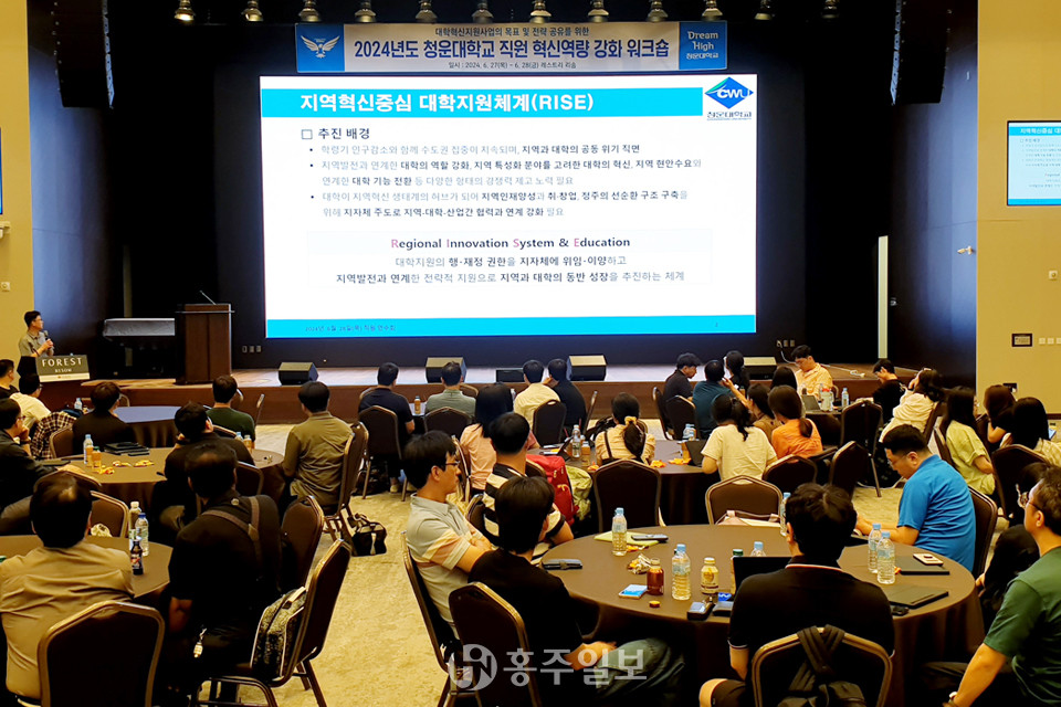 청운대학교(총장 정윤)는 지난달 27~28일까지 대학혁신지원사업의 일환으로 충북 제천에 위치한 레스트리 리솜에서 전 직원이 참여한 2024 하계 직원 혁신역량 강화 워크숍을 개최했다. 또한 ESG 경영을 실천하기 위해 태블릿PC 등을 활용한 업무 효율을 높이기 위해 전문가를 초청해 교육도 진행했다.