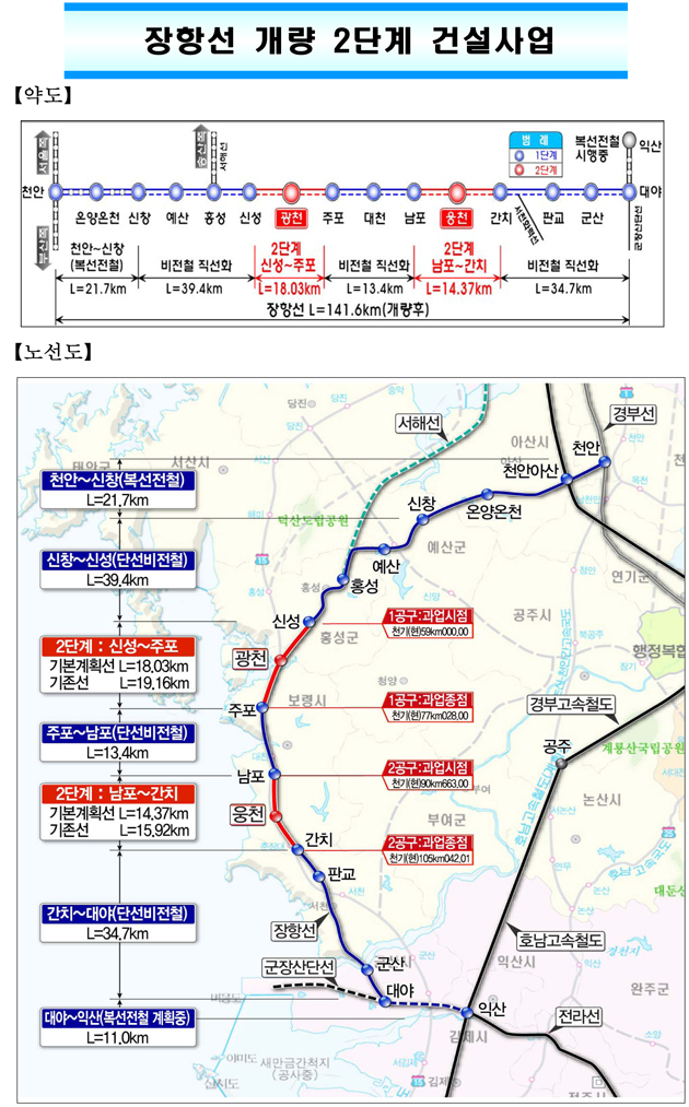 장항선 개량 2단계 건설사업 신성~주포(18.0km) 구간 노선변경에 따른 광천지역 주민설명회가 개최됐다. 한국철도시설공단 주관으로 지난달 28일 오전 10시 광천복지문예회관에서 개최된 주민설명회는 궂은 날씨에도 불구하고 200여 주민이 참석하는 등 지역주민들의 관심이 뜨거웠다. 이날 주민설명회는 장항선 2단계 개량사업에 대한 기본계획 설명과 변경된 노선 안내, 추진현황 보고, 주민들의 의견제시와 답변으로 이어졌다. 변경된 실시설계에 따르면 기존 홍주미트 앞에 짓기로 했던 광천역사를 도보이용이 가능하도록 광천읍내 신진사거리를 지나 광신철재 앞 야산으로 변경했다. 설계시공사 측은 "이번 장항선 노선변경은 직선화를 원칙으로 했다. 직선화로 열차 속도를 최고 시속 250km로 높일 것"이라고 밝혔다.