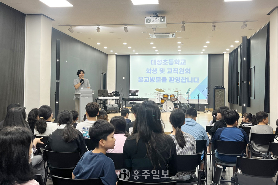 한국K-POP고등학교(교장 박병규)는 지난 8일 대정초등학교 전교생 29명과 교사 9인이 진로 체험의 날을 맞이해 본교를 방문했다고 밝혔다.<사진>