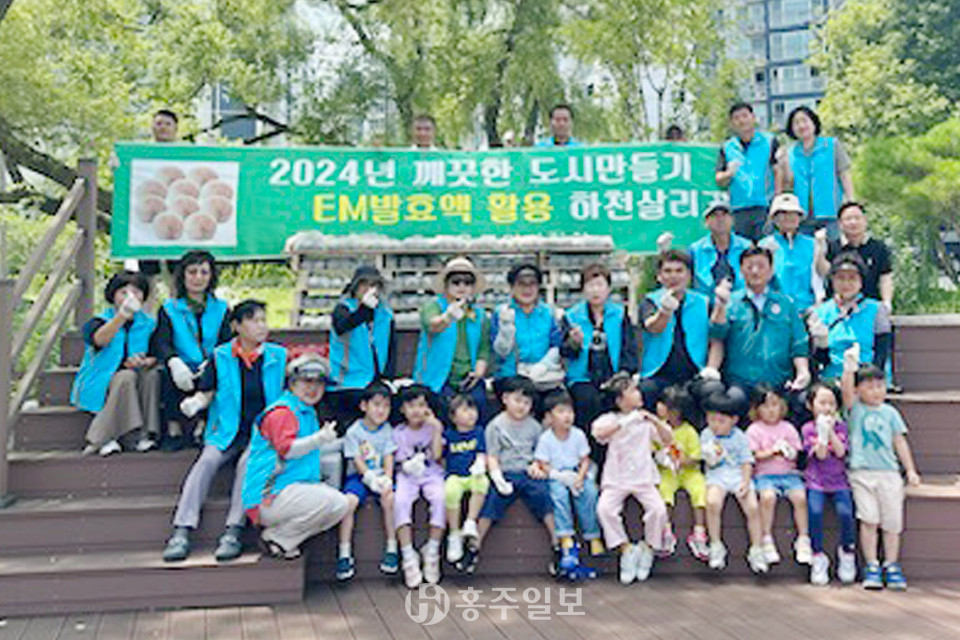 홍성읍주민자치회(회장 성낙홍)는 지난 12일 지역 어린이들과 함께 자체 제작한 EM흙공을 활용해 역재방죽 정화 활동을 성공적으로 진행했다.<사진>