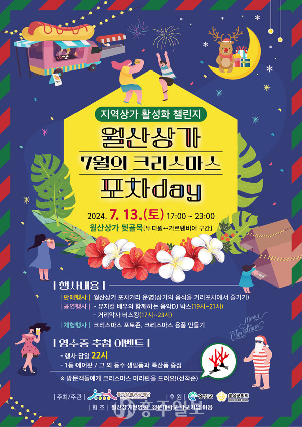홍성군이 지역 상권 활성화를 위해 오는 13일 월산상가 일원에서 월산상가번영회와 함께 ‘월산상가 7월의 크리스마스 포차데이’ 행사를 개최한다. 이번 행사는 침체된 지역상가에 활기를 불어넣기 위해 기획됐으며, 한여름에 크리스마스 분위기를 즐기며 다양한 음식을 맛볼 수 있는 독특한 콘셉트로 진행된다.