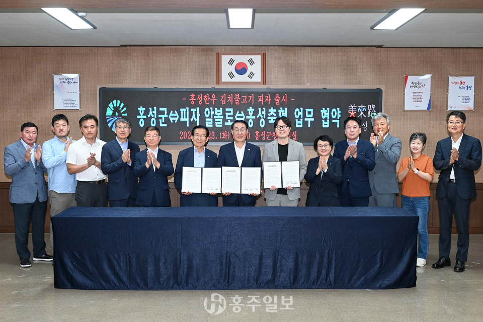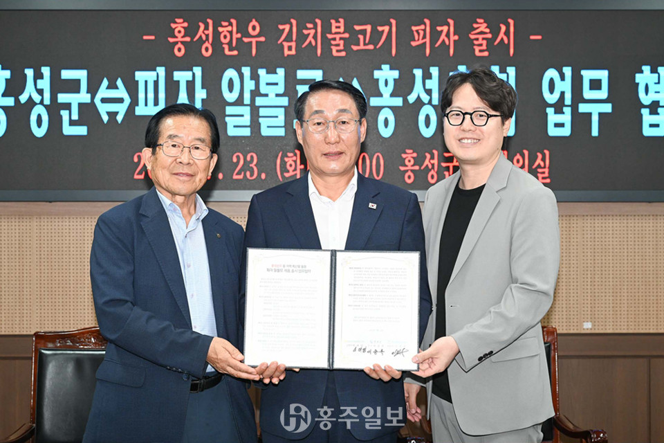 전국 제1의 축산군인 홍성군은 지난 23일 군청 회의실에서 이용록 홍성군수와 이대영 홍성축협조합장, 이재욱 피자알볼로 대표가 참석한 가운데 ‘홍성한우 김치불고기피자’ 출시를 위한 협약식을 가졌다.<사진>