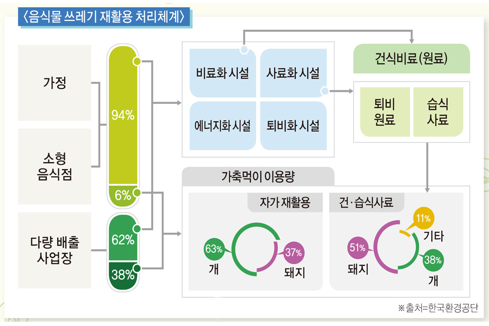 이렇게 버려진 음식물 쓰레기는 비료화, 사료화, 에너지화, 퇴비화로 구분해 처리되는데 그중 가축 먹이로 사용되는 사료는 개와 돼지 먹이의 비율이 가장 높다고 해요. 보다 자세한 내용은 본문 상단의 <음식물 쓰레기 재활용 처리체계>를 통해 확인할 수 있어요.