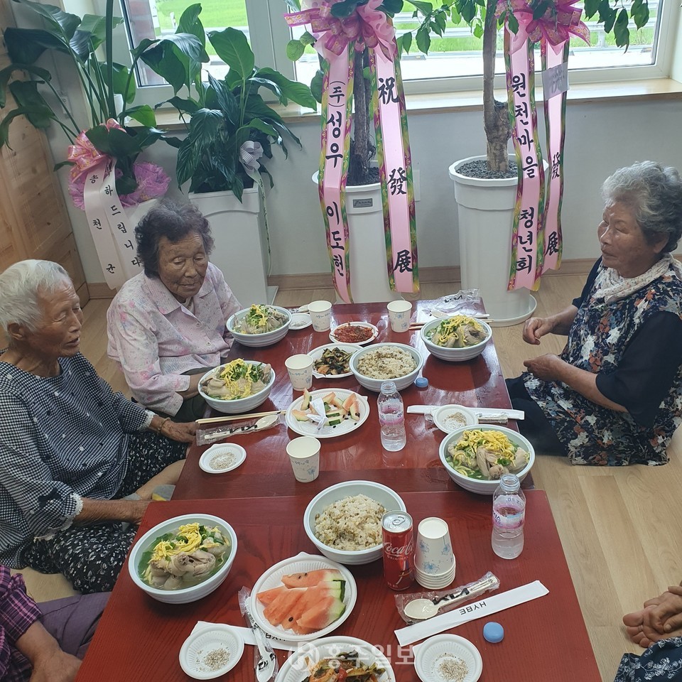 결성면 원천마을부녀회(회장 황선희)는 지난 25일 중복을 맞아 마을 어르신들을 위해 삼계탕을 준비해 대접했다.<사진>