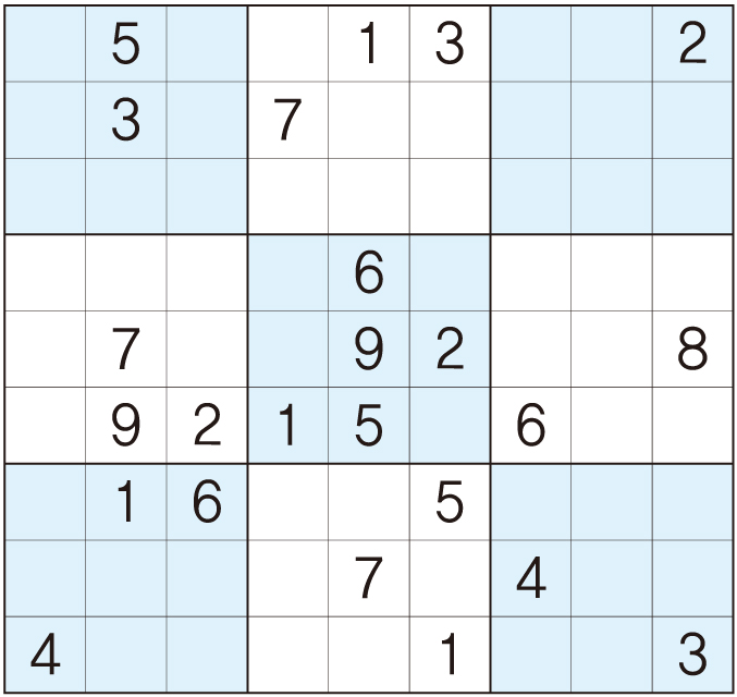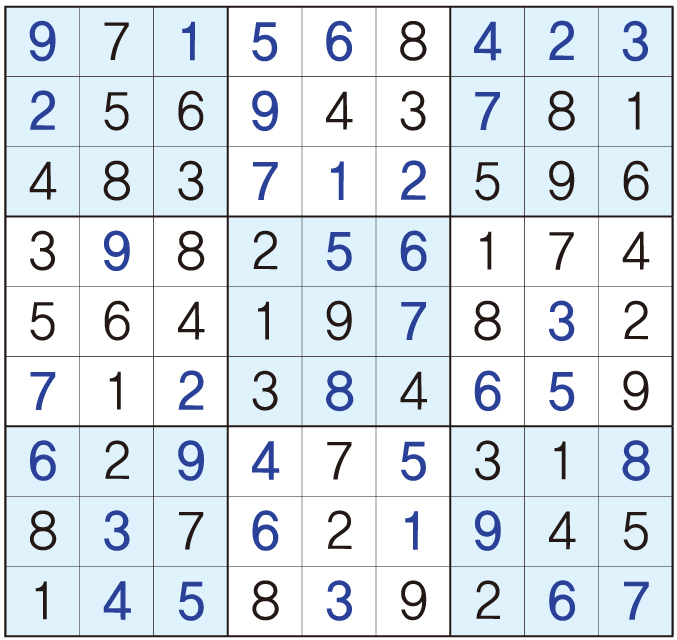 3. 큰 정사각형(9x9) 안에 있는 작은 정사각형(3x3) 안에는 숫자 1~9가 각 한 번씩 들어간다.