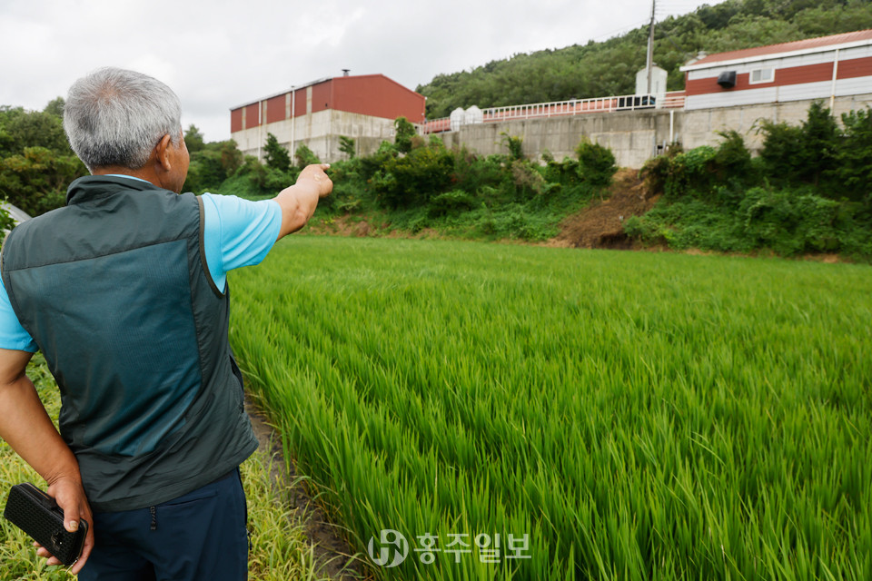 지난달 26일 오후 결성면 원천마을 전 마을이장 송윤호 씨의 2714㎡(821평) 규모 벼농사 경작지에 흘러내린 가축분뇨는 논 전체를 에워쌌다.