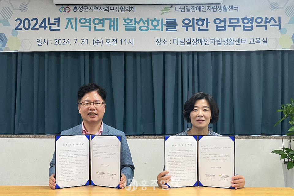 홍성군지역사회보장협의체(공동위원장 정윤)와 다님길장애인자립생활센터(센터장 황영란)는 31일 다님길장애인자립생활센터 교육실에서 지역연계 활성화를 위한 업무협약식을 체결했다.<사진>