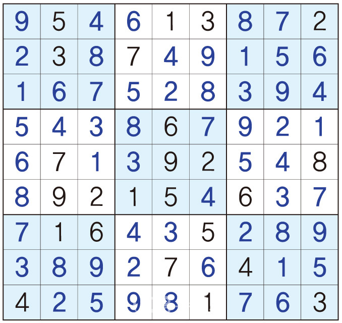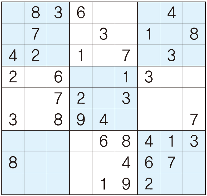 3. 큰 정사각형(9x9) 안에 있는 작은 정사각형(3x3) 안에는 숫자 1~9가 각 한 번씩 들어간다.