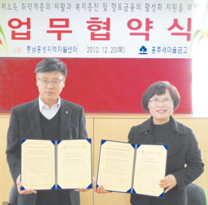 | << 충남홍성지역자활센터(센터장 윤명희)와 홍주새마을금고(이사장 오세승)는 지난 20일 저소득 취약계층의 자활과 복지증진 및 향토금융의 활성화 지원을 위한 업무협약식을 가졌다. 홍주새마을금고는 사회복지법인 유일원 라온의집에 정기적으로 후원을 해오고 있으며, 이번 업무협약을 통하여 정기적 후원을 약속하는 등 홍성군의 사회복지증진에 깊은 관심과 지원을 아끼지 않고 있다. |