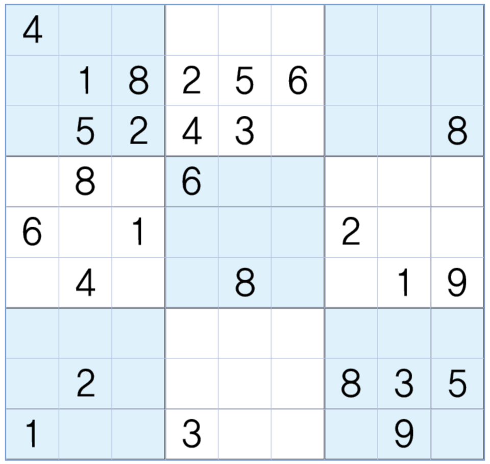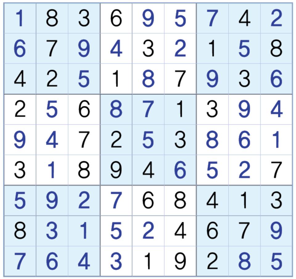 3. 큰 정사각형(9x9) 안에 있는 작은 정사각형(3x3) 안에는 숫자 1~9가 각 한 번씩 들어간다.