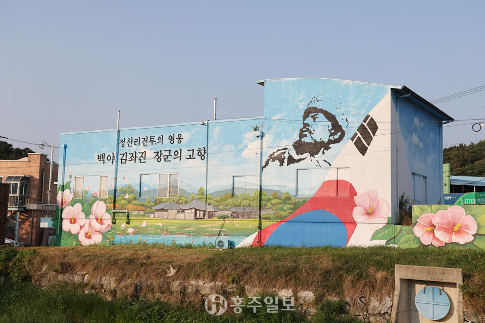 사진은 갈산면 소재지를 따라 흘러내리는 갈산천 인근 한 건물 외벽에 그려진 백야 김좌진 장군의 벽화.