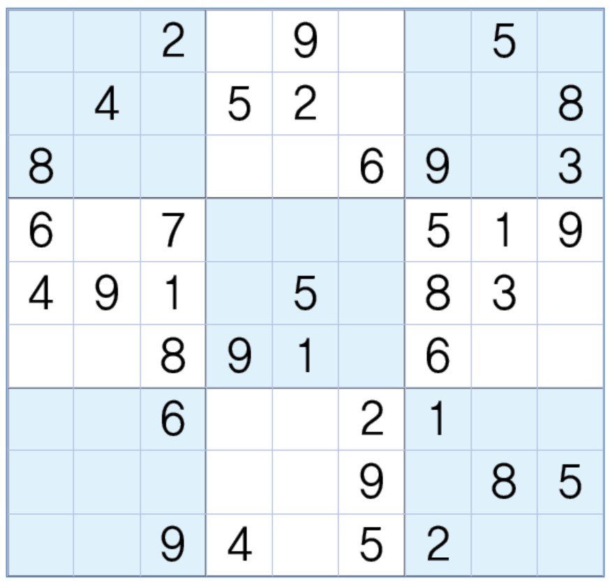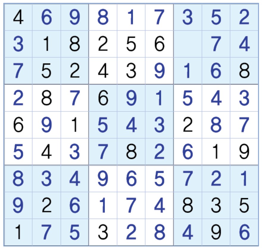 3. 큰 정사각형(9x9) 안에 있는 작은 정사각형(3x3) 안에는 숫자 1~9가 각 한 번씩 들어간다.