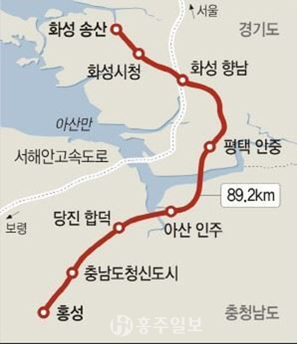문제의 직결 구간은 서해선(경기 평택 청북)과 경부선(경기 화성 향남) 고속철도를 연결하는 상하행선 7.35㎞ 구간으로 총사업비는 6843억 원이다. 이 구간에서 서해선과 경부선이 가장 근접해 있어 사업이 실현되면 홍성에서 서울 용산까지 48분이면 도착할 수 있다. 이 구간 연결은 서해선 복선전철의 KTX 시대를 여는 본질이기도 하다. 서해선과 신안산선과의 연결 사업이 불능 상황이 되면서 환승을 하지 않고 수도권에 가려면 이 구간을 연결하지 않고는 다른 수단이 없기 때문이다. 서해선 KTX 고속철도망은 오는 2026년 착공, 2030년 개통 예정이다.