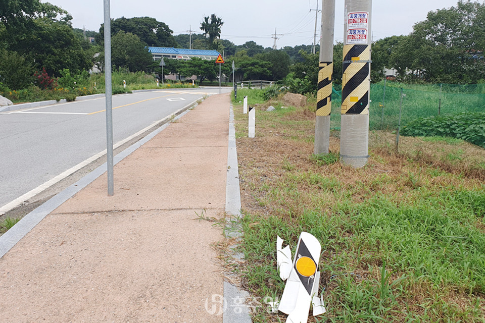 지난 3일 홍북읍 상하리 마을회관에서 용봉초등학교로 이어지는 길에 설치된 야간표시등 10개가 심하게 파손돼 제 기능을 하지 못하고 있는 상황이 발생했어요. 저녁 시간대 마을 길이 칠흑같이 어두워져 주민들의 안전 문제가 걱정되는 실정입니다.