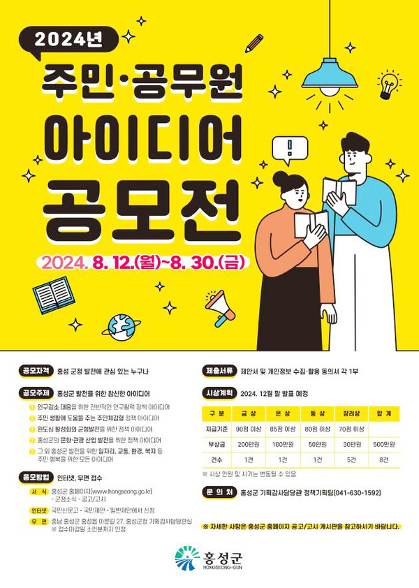 홍성군이 다양한 계층의 창의적 아이디어를 수렴해 군정 발전의 새로운 동력을 마련하고 주민 참여를 활성화하기 위해 ‘2024년 주민·공무원 아이디어 공모전’을 개최한다.