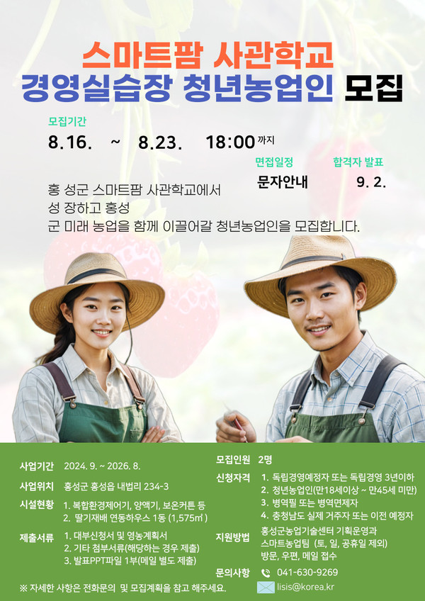 홍성군이 청년들의 스마트농업 창업을 지원하기 위해 오는 16일부터 23일까지 임대형 스마트팜 사관학교 청년농업인을 모집한다.
