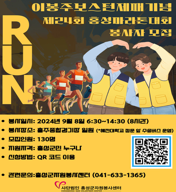 (사)홍성군자원봉사센터(센터장 방은희)는 다음달 8일 개최되는 ‘제24회 홍성마라톤대회’의 자원봉사자 130명을 모집한다. 이번 대회에 참여하는 자원봉사자는 △주로 급수대 운영 △물품 보관소 등 총 11개 분야에서 활약할 예정이다.