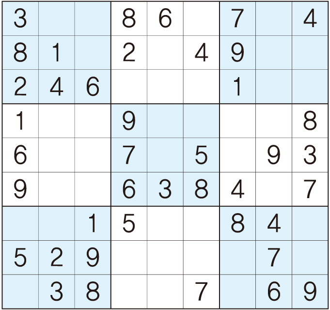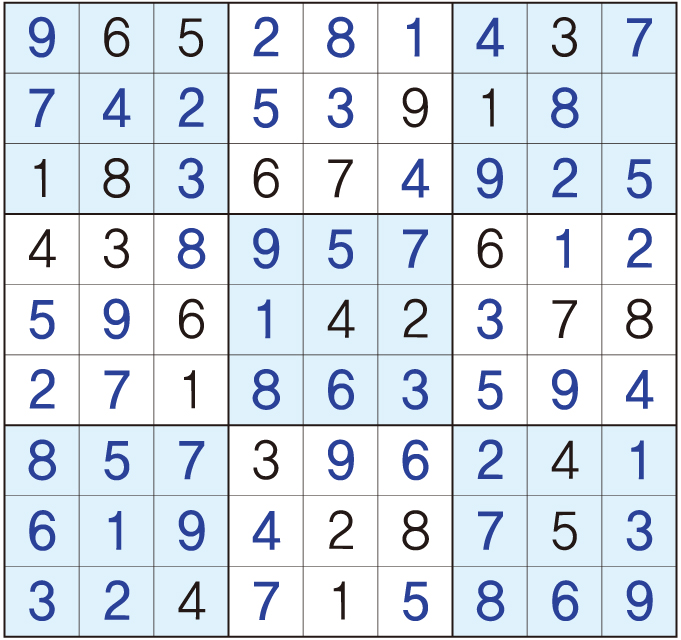 3. 큰 정사각형(9x9) 안에 있는 작은 정사각형(3x3) 안에는 숫자 1~9가 각 한 번씩 들어간다.