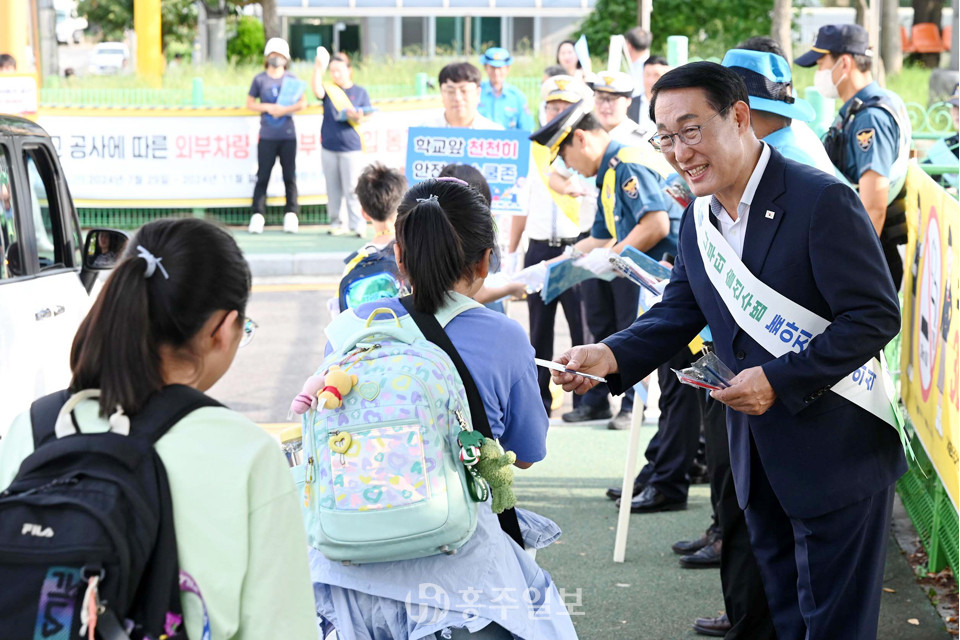 사진은 지난 3일 홍성초등학교 일대에서 펼쳐진 교통안전 캠페인 현장에서 이용록 군수가 학생들에게 캠페인 물품을 나눠주고 있는 모습.