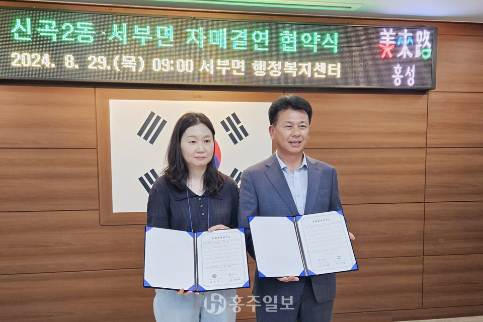 홍성군 서부면과 경기도 의정부시 신곡2동이 도농 상생발전을 위해 지난달 29일 서부면 행정복지센터에서 자매결연 협약을 체결했다.<사진>