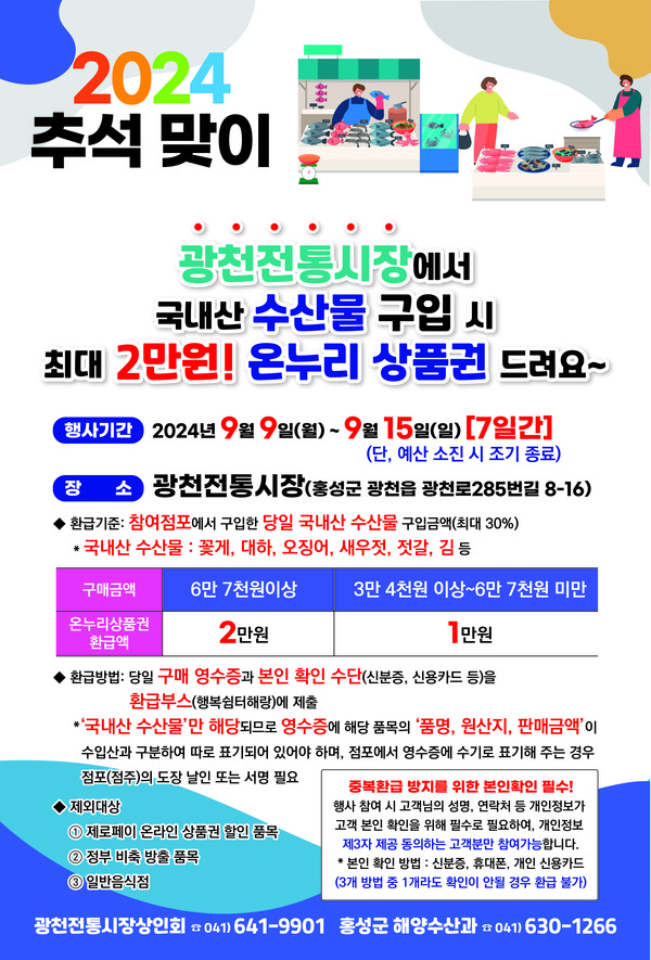 이번 행사는 추석 명절을 앞두고 물가 상승과 내수경기 침체로 어려움을 겪는 수산시장 활성화를 위해 한 주간 광천전통시장 72개 점포에서 진행된다.