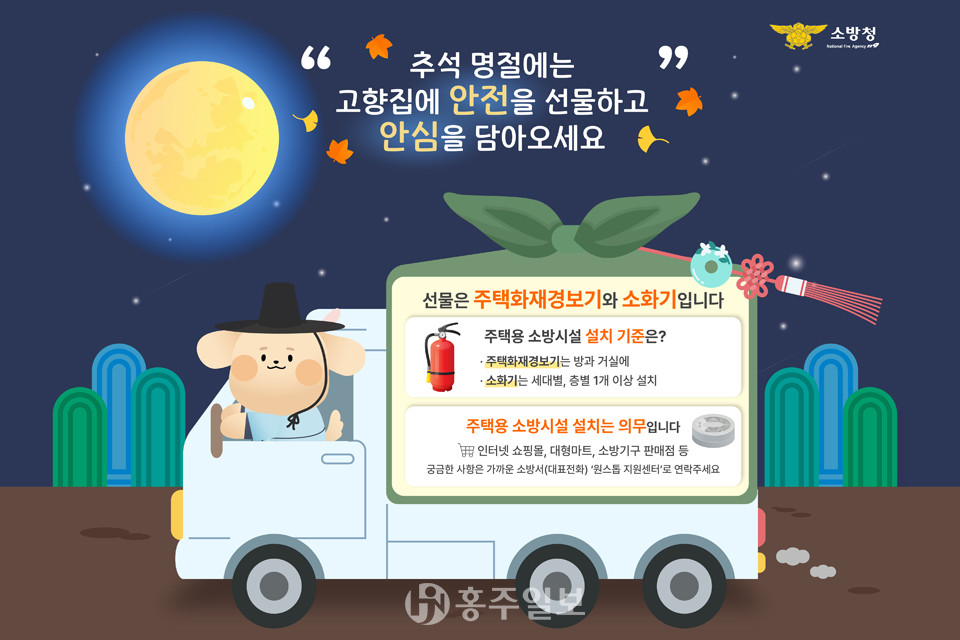 박지영 홍성소방서 예방안전과장은 “추석 명절에는 평소보다 많은 음식을 조리하면서 부주의로 인한 화재 등이 증가한다”며 “화재 초기에 큰 도움을 주는 주택용 소방시설 비치는 내 가족의 생명과 재산을 지키는데 매우 중요하다”고 강조했다.