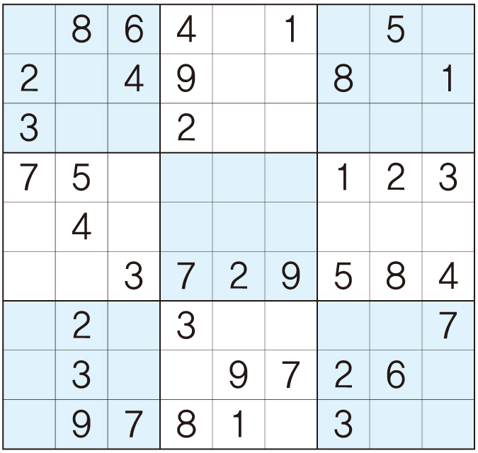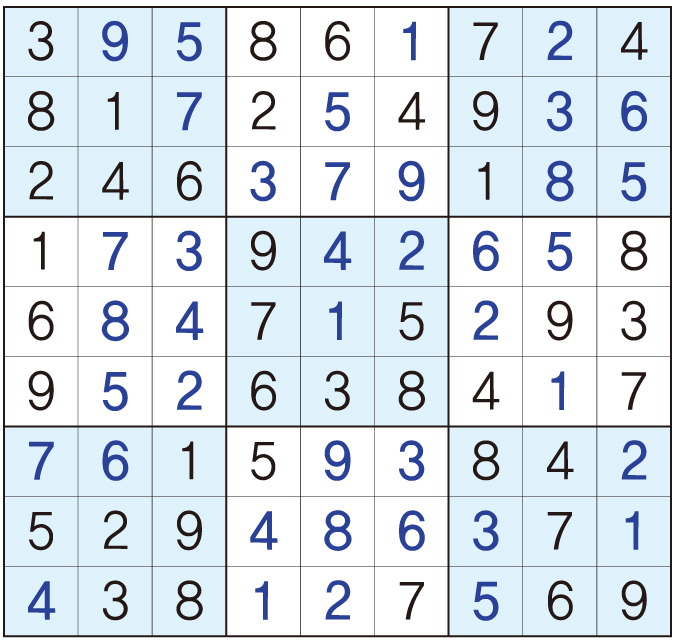 3. 큰 정사각형(9x9) 안에 있는 작은 정사각형(3x3) 안에는 숫자 1~9가 각 한 번씩 들어간다.