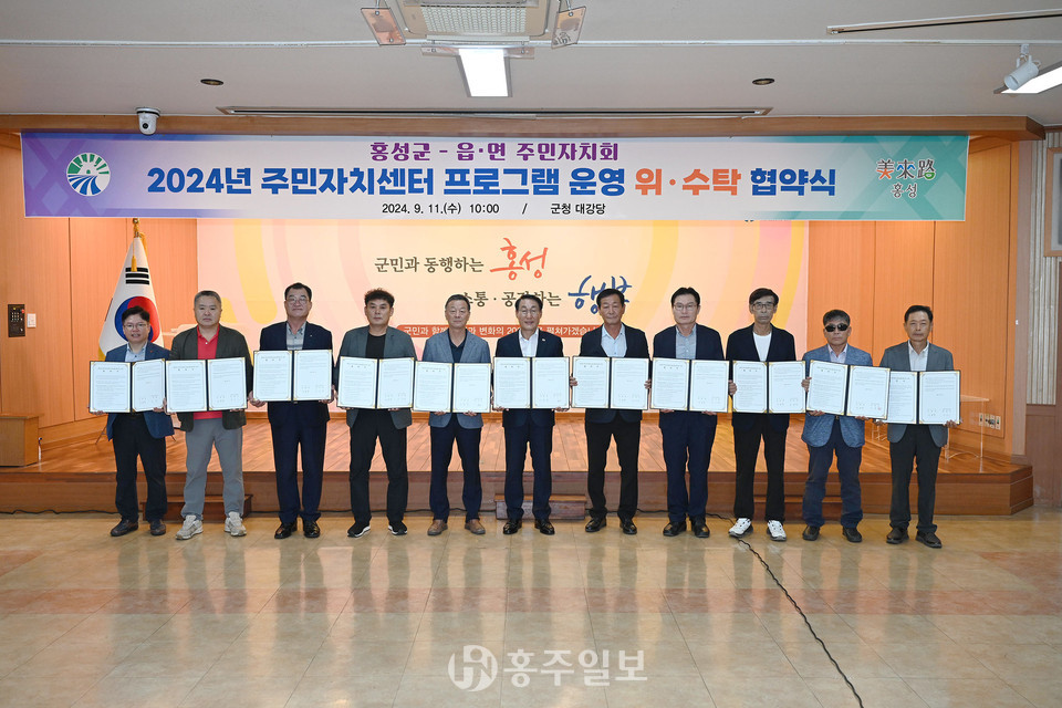 홍성군은 지난 11일 군청 대강당에서 읍·면 주민자치회와 주민자치센터 프로그램 운영에 관한 위‧수탁 협약을 체결했다.<사진>